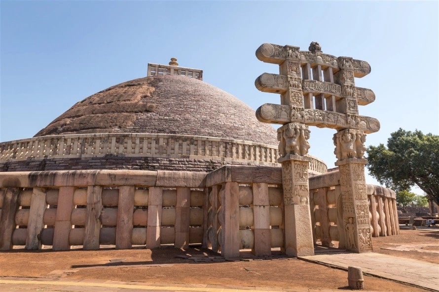 - संरचना: अर्धगोलाकार स्तूप, जिस पर चार सुंदर तोरणद्वार (गेटवे) बने हैं।