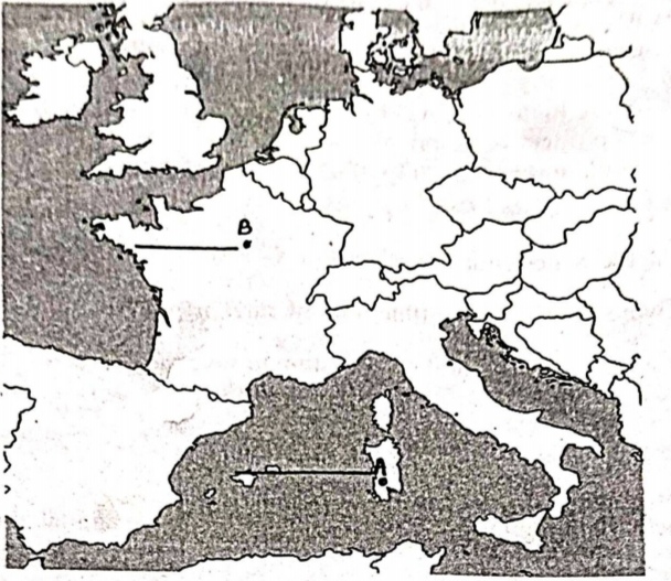 34.2 पश्चिमी यूरोप के दिए गए मानचित्र मे A और B स्थानों को खींची गई रेखा पर दर्शाइये l