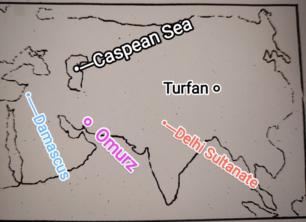 Q34. On the given outline map of Mongol Empire, Locate and label the following places with appropriate symbols.